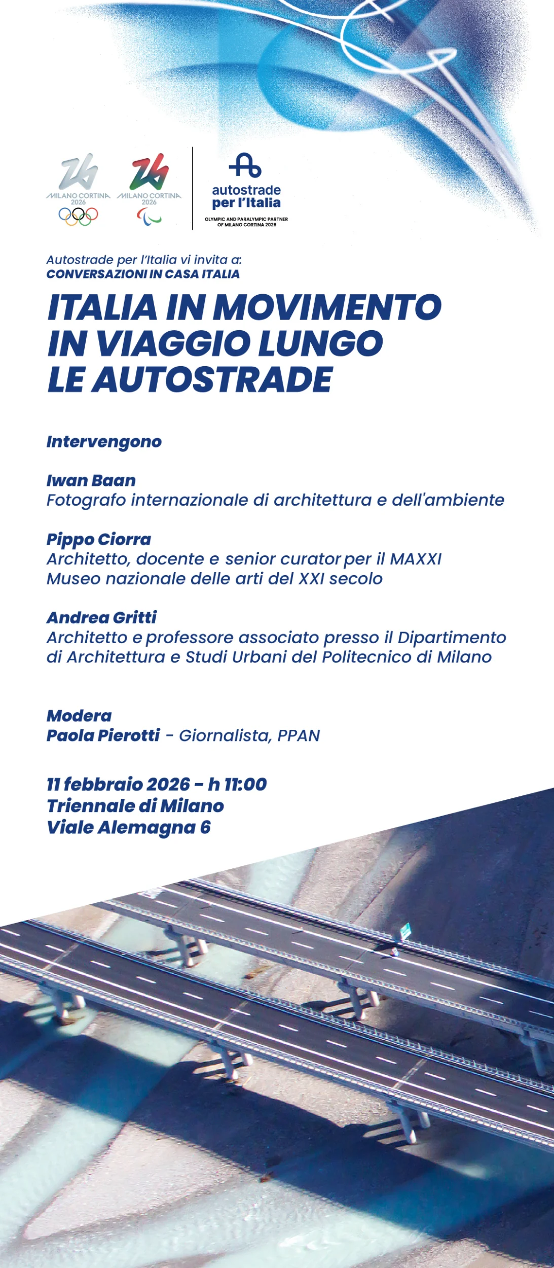 Autostrade per l’Italia avrà inoltre una presenza qualificata presso Casa Italia alla Triennale di Milano. Qui, il tema delle infrastrutture sarà centrale nel racconto del Paese attraverso la mostra «Italia in Movimento. Autostrade e Futuro», realizzata con il MAXXI - Museo nazionale delle arti del XXI secolo. Un’esposizione che riflette sul ruolo della rete nel plasmare il paesaggio e la società, proiettando la mobilità verso una visione di lungo periodo.