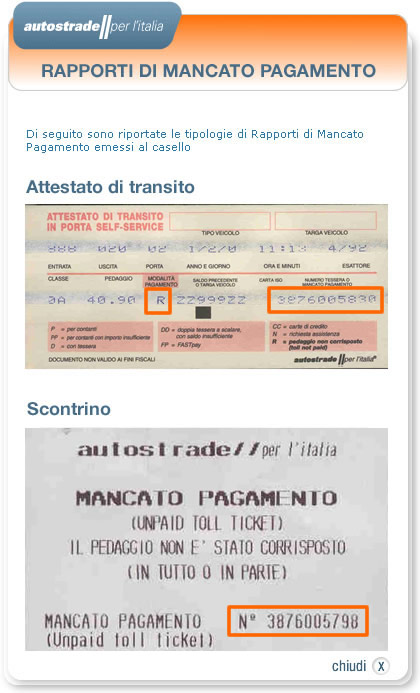 Payment of unpaid toll can also be made at all post offices, by paying the amount due to Autostrade per l'Italia, account number 371500, indicating the vehicle licence plate number and the non-payment number.