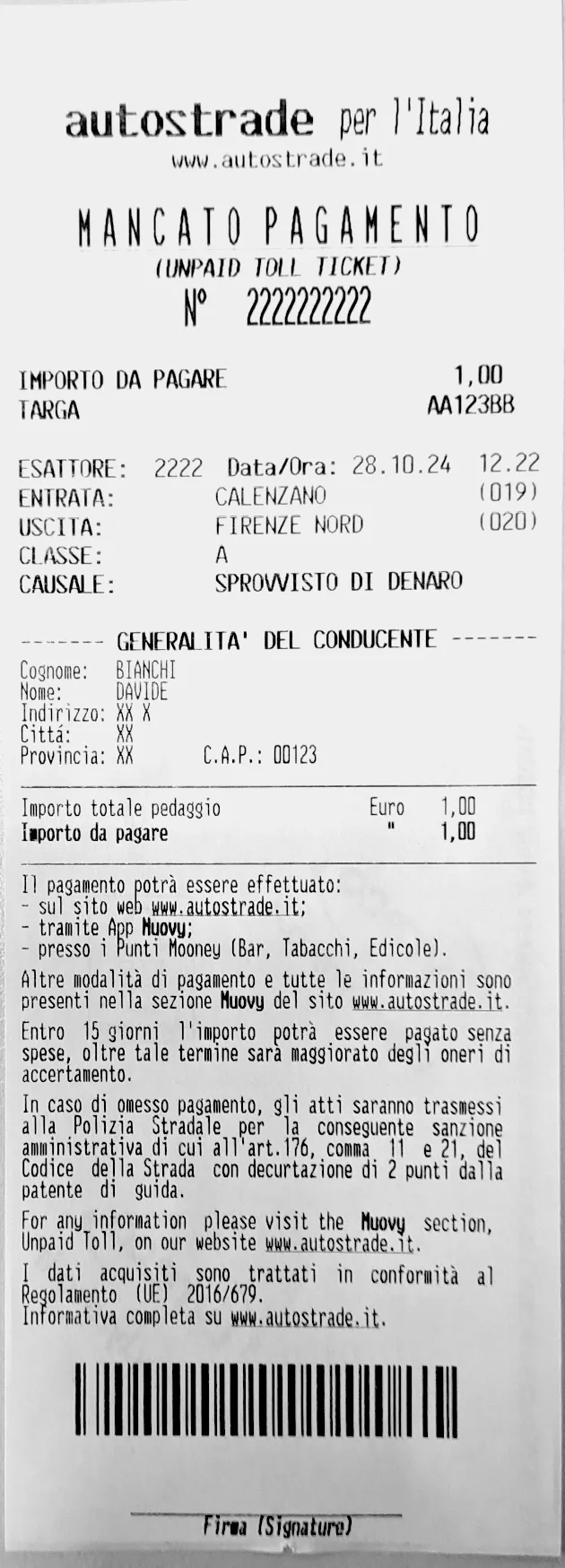 When the toll is not paid, either in full or in part, a receipt is issued for non-payment, both in manned and automatic lanes. On each receipt (Non-Payment Report) the vehicle data (class and number plate), the transit data (date, time, exit tollgate and, where available, also the entry tollgate and the amount to be paid) are recorded. This data feeds a centralised database, for the consequent execution of civil, administrative and/or criminal actions where the prerequisites under Article 176 of Legislative Decree 285/1992 apply.