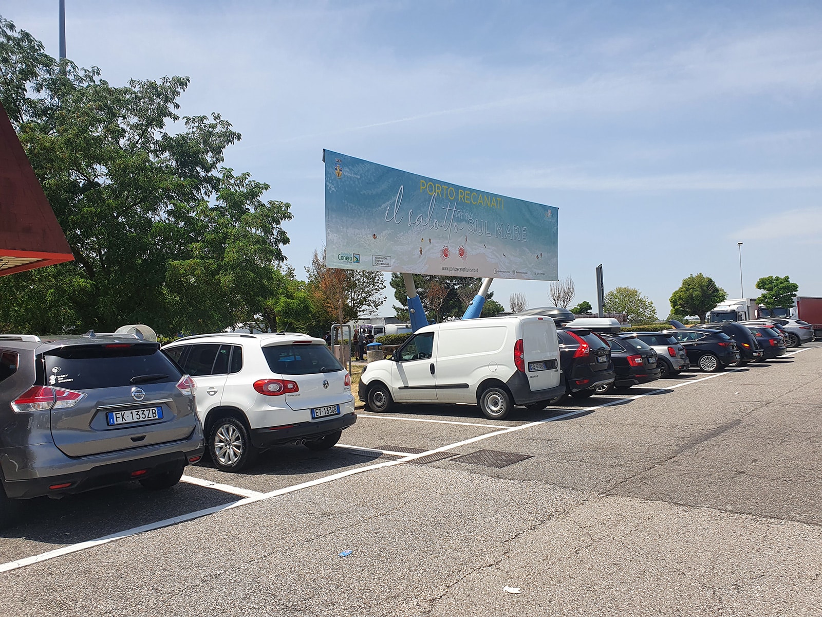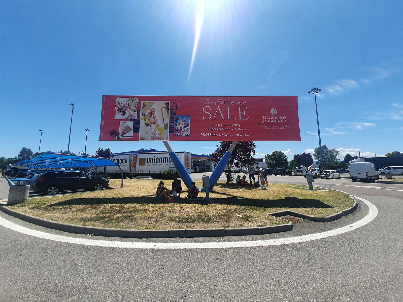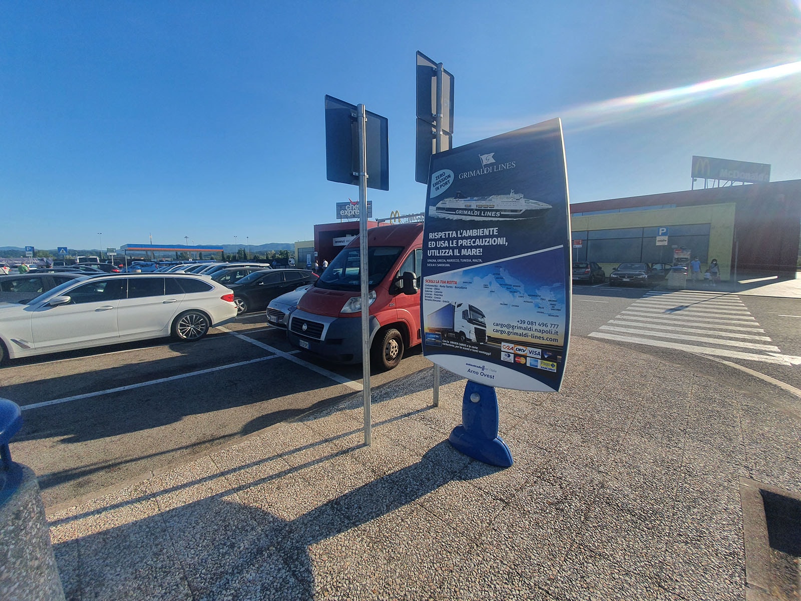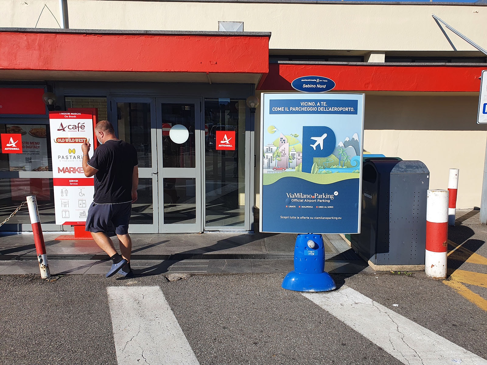 Sono cartelli pedonali dal profilo snello e sinuoso ad alto impatto visivo; sono posizionati in prossimità dell'ingresso dei punti di ristoro e lungo i percorsi pedonali per valorizzare il contatto "face to face" con il pubblico che si muove dalla zona parcheggi al ristorante e e viceversa.