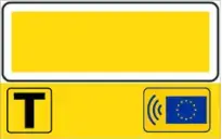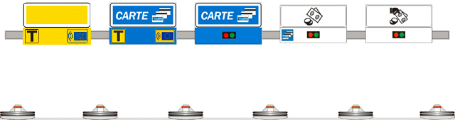 Lo sfondo giallo indica in maniera univoca l'esazione dinamica tramite dispositivi di telepedaggio. Il cartello presenta la “T” di Telepedaggio e la bandiera europea per segnalare ulteriormente che si tratta di porte dedicate ai soli possessori di dispositivi di telepedaggio.